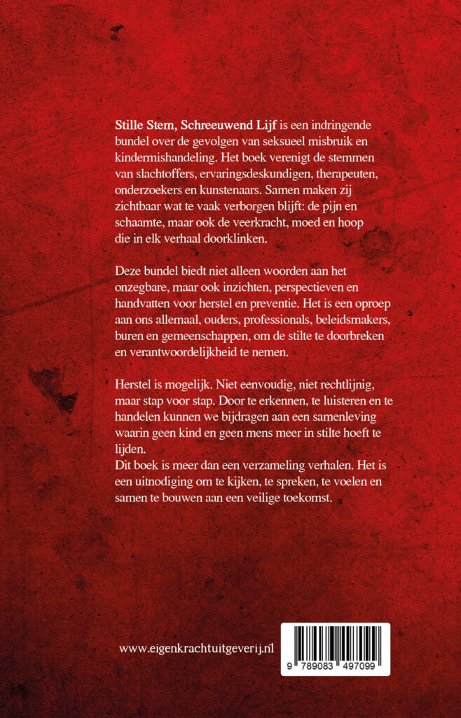 Samen met 13 andere auteurs mocht ik meeschrijven aan dit boek. Het boek verenigt de stemmen van slachtoffers, ervaringsdeskundigen, therapeuten, onderzoekers en kunstenaars. Samen maken wij zichtbaar wat te vaak verboden blijft: de pijn en schaamte, maar ook de veerkracht, moed en hoop die in elk verhaal doorklinken.